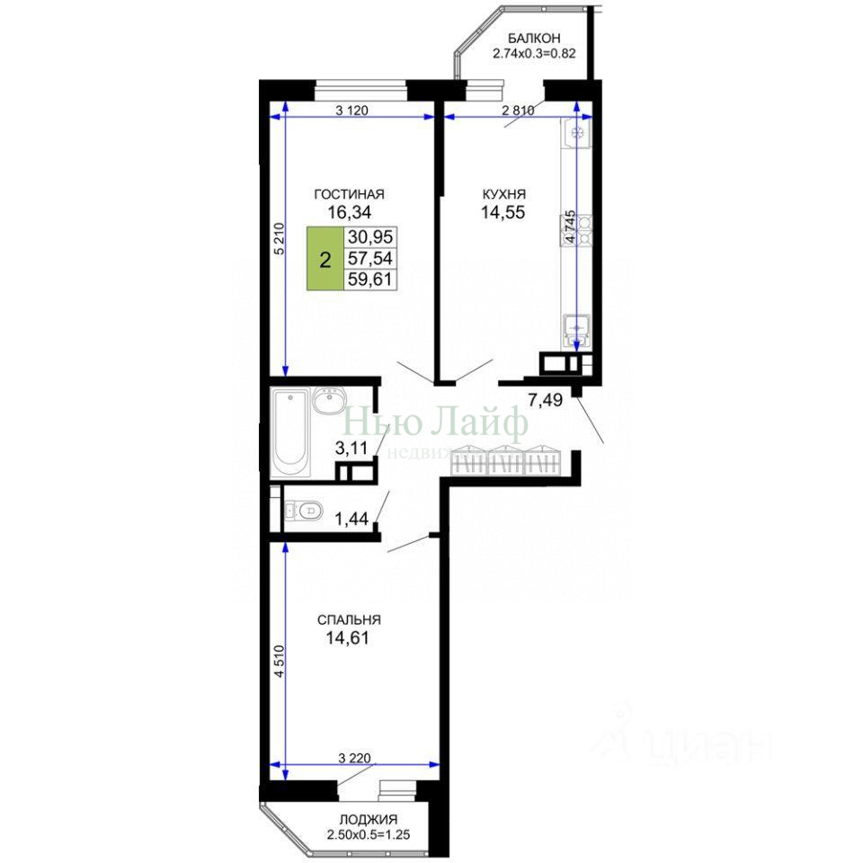В избранное Продается 2-комн. квартира, 59,61 м²